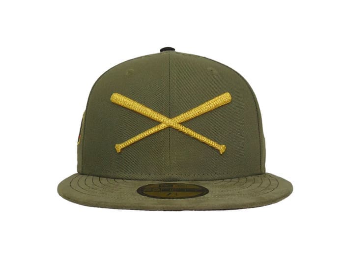Join JustFitteds in celebrating with Ramin for the latest variation of the brand’s fan-favorite cap. Here is the Crossed Bats Logo Ramins Birthday 59Fifty Fitted Hat. The crown has olive panels and a black button on top. The Crossed Bats logo is rendered in metallic gold raised embroidery for the front design. Embroidered on the right panel is a black cat, and on the left is the New Era Flag. The bill has an olive uppervisor and woodland camo with “Heavy Hitters” embroidery for the undervisor. At the back is a JustFitteds logo. Available at the JustFitteds webstore.
