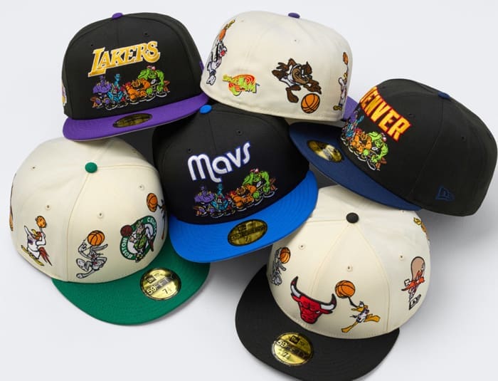 NBA teams up with Space Jam and New Era for an exclusive set of headwear goods. Take your pick from the NBA x Space Jam 59Fifty Fitted Hat Collection. A total of 14 NBA teams are included in this drop. Each team gets a Monstar cap that features the monsters with the team logo, as well as a Tune Squad logo, which features the characters across the six panels of the dome. They added a neutral tone by using gray for the undervisor of the bill. On the left panel is the New Era Flag, and at the back is the Space Jam logo. View the whole collection here.