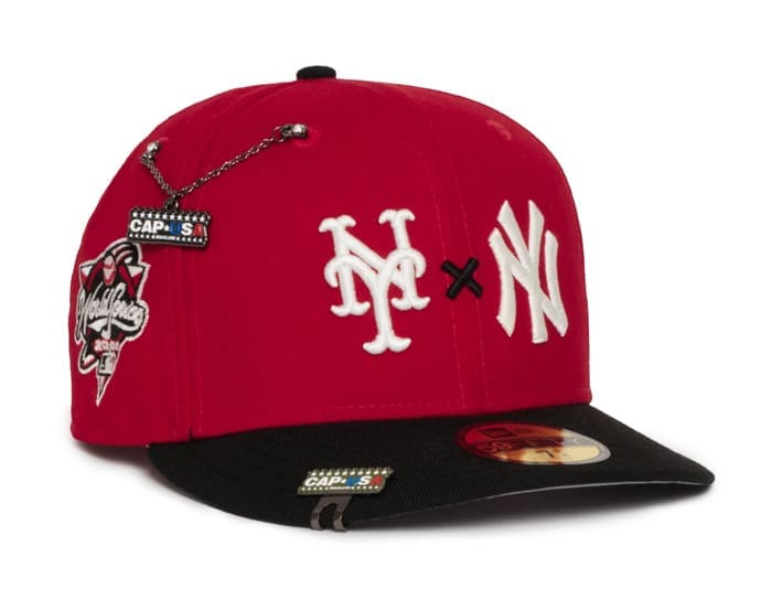 Cap USA Harlem goes for a baseball cap that represents both of New York’s MLB teams. Add more fire to your drip with the New York Yankees x Mets 2000 World Series Black Red 59Fifty Fitted Hat. This cap comes in a two-tone look with its red panels and black for the button & the undervisor. The 3D front embroidery features the New York Mets logo on the right front panel and the New York Yankees logo on the left. On the right panel is the 2000 MLB World Series side patch, and on the left is the New Era Flag. The MLB Batterman is embroidered in tri-color at the back. Available here.
