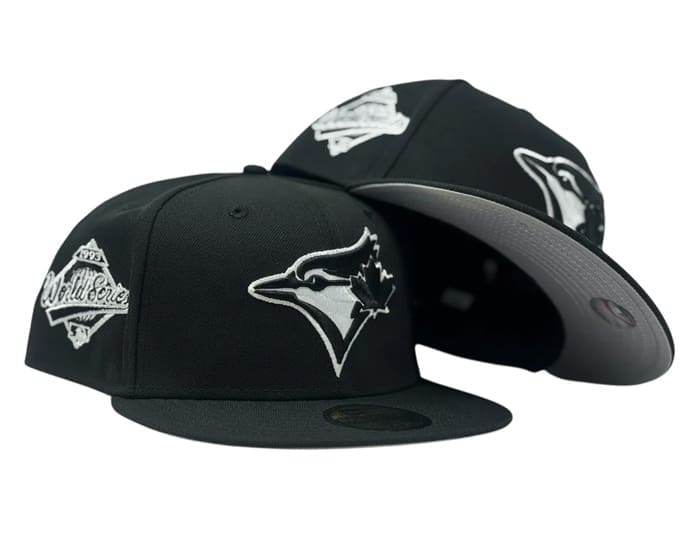 Go for a baseball cap in a minimalist colorway, featuring one of the recent releases from Sports World 165. Here is the Toronto Blue Jays 1993 World Series Black 59Fifty Fitted Hat. The dome and uppervisor are made of black fabric. The Toronto Blue Jays logo is rendered in black & white for the 3D front embroidery. The right panel features the 1993 MLB World Series side patch, while the left has the New Era Flag. The undervisor of the bill is in gray to keep up with the color scheme. The MLB Batterman takes its usual spot at the back. Click here if you want one.